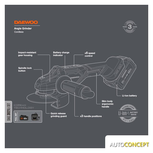 | Комплект поставки | - Углошлифовальная машина - 1 шт.- Аккумулятор 4.0 Ач - 1 шт.- Зарядное устройство - 1 шт.- Фланец - 1 шт.- Ключ - 1 шт.- Дополнительная рукоятка - 1 шт.- Защитный кожух - 1 шт.- Руководство по эксплуатации - 1 шт.- Кейс |