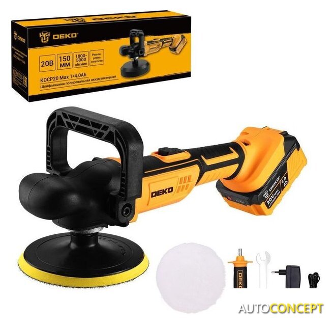 | Комплект поставки | - Шлифмашина – 1 шт.- Опорная тарелка – 1 шт.- Полировальный круг (шерстяной) – 1 шт.- Аккумулятор 4,0 Ач – 1 шт.- Зарядное устройство – 1 шт.- Дополнительная рукоятка – 1 шт.- Винт – 2 шт.- Шестигранный ключ – 1 шт.- Руководство по эксплуатации- Коробка |