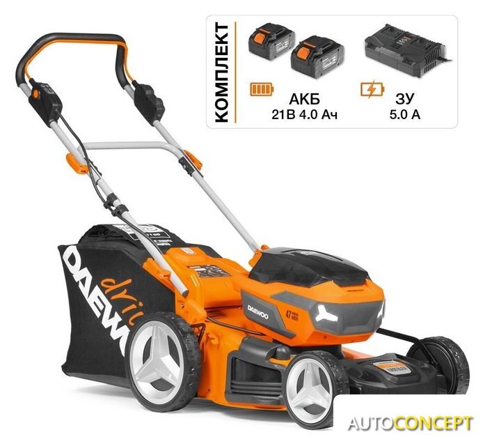 | Комплектация | - Газонокосилка - 1 шт., - Аккумулятор 4,0 Ач - 2 шт., - Зарядное устройство - 1 шт., - Нижняя часть рукоятки - 1 шт., - Верхняя рукоятка - 1 шт., - Травосборник - 1 шт., - Крепежные элементы - 1 комплект, - Руководство по эксплуатации, - Гарантийный талон, - Коробка |