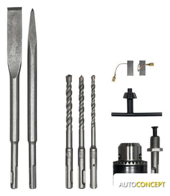 | Комплект поставки | • перфоратор• буры по бетону (6x150, 8x150, 10x150 мм)• зубило плоское (20x250 мм)• зубило пиковое (250 мм)• сверлильный патрон (с хвостовиком SDS−Plus)• дополнительная рукоятка• ограничитель глубины• ключ для патрона• комлпект угольных щеток• кейс• руководство по эксплуатации• гарантийный талон |