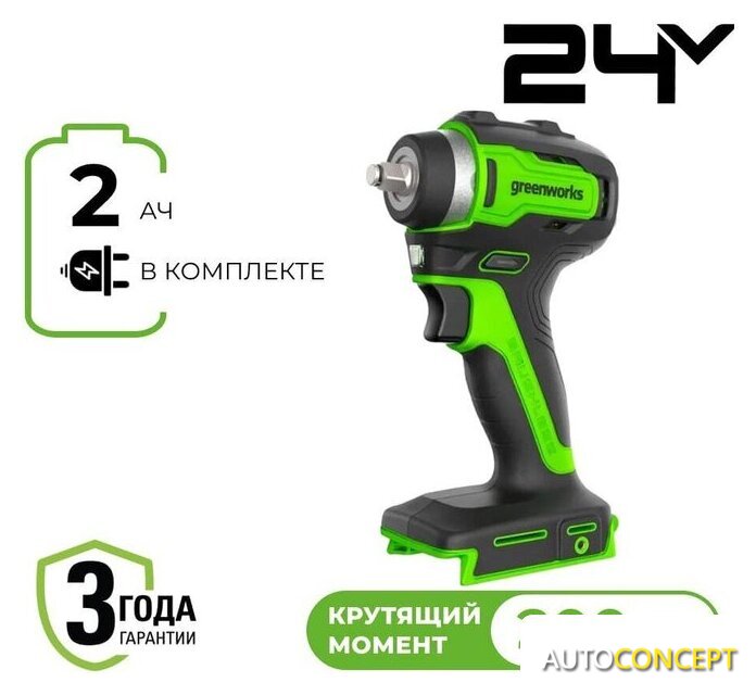 | Комплектация | - Гайковерт ударный Greenworks G24IW200; - 1 хАКБ 2Ач;- 1 х Зарядное устройство; - Руководство по эксплуатации;- Гарантийный талон;- Картонная коробка. |
