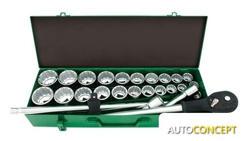 | Комплектация | - 22 торцевых 12-гранных головок: 22, 24, 27, 30, 32, 36, 38, 41, 46, 50 мм. 7/8,5/16, 1, 1-1/8, 1-3/16, 1-5/16, 1-3/8, 1-7/16, 1-5/8, 1-3/4,1-7/8,2 дюйма- 2 удлинителя размером на 100 и 200мм,- вороток с плавающей головкой размером 510мм- трещотка на 24 зубца. |