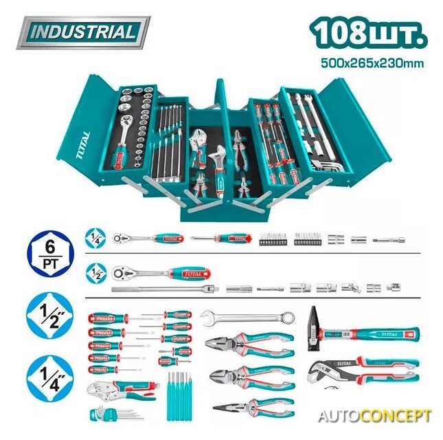 | Комплектация | Ключи и головки (1/4" дюйма): Трещоточный ключ 1/4" - 1 шт. Головки 1/4": 4, 4.5, 5, 5.5, 6, 7, 8, 9, 10, 11, 12, 13, 14 мм - 13 шт. Удлинители 1/4": 50 мм и 100 мм - по 1 шт. Вороток 1/4" x 150 мм - 1 шт. Держатель бит 1/4" → 6.35 мм - 1 шт. Биты для отверток - 20 шт. Плоские (SL): SL3, SL4, SL5, SL6. Крестовые (PH): PH0, PH1, PH2, PH3. Улучшенные крестовые (PZ): PZ0, PZ1, PZ2, PZ3. Звездообразные (Torx): T10, T15, T20, T30. Шестигранные (Hex): H3, H4, H5, H6.Ключи и головки (1/2" дюйма): Трещоточный ключ 1/2" - 1 шт. Карданный шарнир 1/2" - 1 шт. Головки 1/2": 10, 11, 12, 13, 14, 15, 16, 17, 18, 19, 20, 21, 22, 23, 24, 27, 30, 32 мм - 18 шт. Свечные головки 1/2": 16 мм и 21 мм - по 1 шт. Удлинители 1/2": 125 мм и 250 мм - по 1 шт. Гибкая рукоятка 1/2" x 375 мм - 1 шт. Трехсторонний переходник 1/2" → 3/8" - 1 шт.Отвертки: Плоские (SL): 3x75 мм, 4x100 мм, 5.5x100 мм, 6.5x38 мм, 6.5x125 мм, 8x150 мм. Крестовые (PH): PH1x75 мм, PH2x125 мм, PH2x38 мм, PH3x200 мм.Гаечные ключи: Накидные/рожковые ключи: 8, 10, 11, 12, 13, 14, 15, 16, 17, 18, 19, 22 мм - 12 шт. Шестигранные ключи: 1.5, 2, 2.5, 3, 4, 5, 6, 8, 10 мм - 9 шт.Плоскогубцы и кусачки: Ключ разводной 10" - 1 шт. Ключ трубный 10" - 1 шт. Длинногубцы 6" - 1 шт. Комбинированные плоскогубцы 8" - 1 шт. Бокорезы 7" - 1 шт. Клещи с изогнутыми губками 10" - 1 шт.Прочие инструменты: Молоток слесарный 300 г - 1 шт. Выколотки: 1.5x152 мм, 3x152 мм, 4x152 мм, 5x152 мм, 6x152 мм, 8x152 мм - 6 шт. |