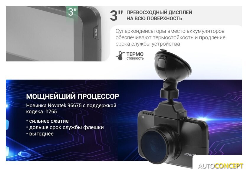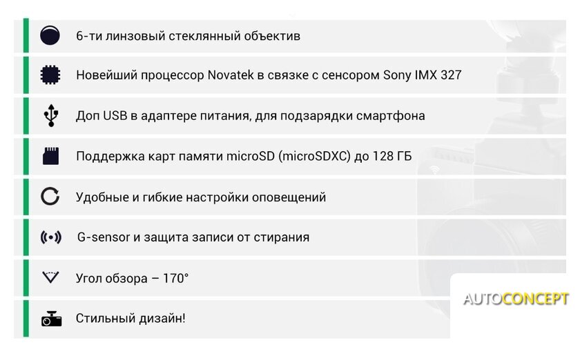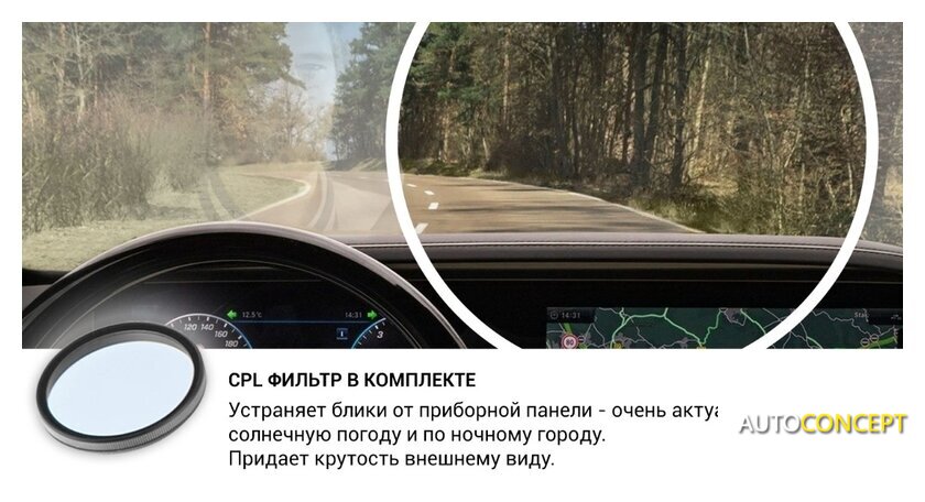 | Комплектация | - видеорегистратор;- камера заднего вида с креплением;- кабель для камеры заднего вида;- поляризационный фильтр (CPL);- крепление на присоске;- доп. крепление на 3М скотче;- автомобильное зарядное устройство;- салфетка для линзы и экрана. |