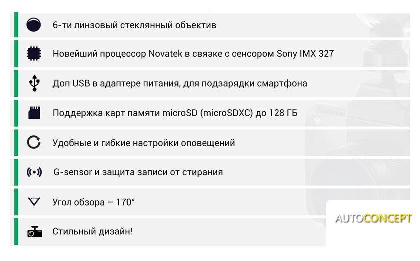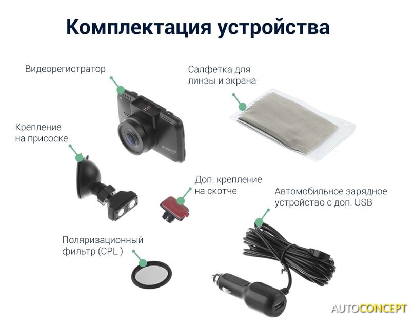 | Комплектация | - видеорегистратор;- поляризационный фильтр (CPL);- крепление на присоске;- доп. крепление на 3М скотче;- автомобильное зарядное устройство;- салфетка для линзы и экрана. |