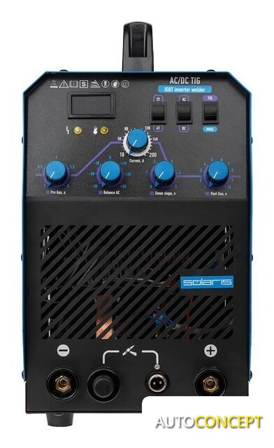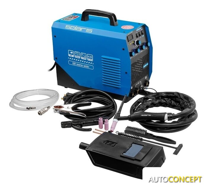 Комплект поставки | Источник сварочного тока;Горелка сварочная TIG 26 серии 3 метра;Электрододержатель с кабелем 3 метра;Клемма заземления с кабелем 3 метра;Шланг газовый с быстросъемными соединениями 5 метров;Щетка и молоток для обработки сварочных швов |