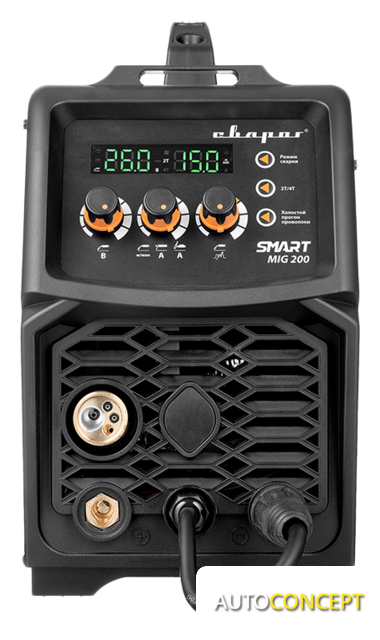 | Сварочный ток | 20 — 200 А (MIG:30–200А, MMA:20–160А, TIG:20–180А) |