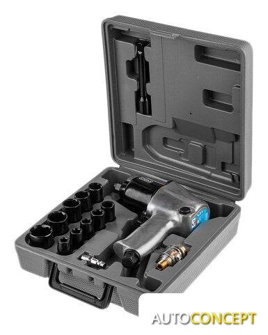 Комплектация | - Пневмогайковерт;- Сменные головки 1/2" - 10 шт;- Удлинитель 1/2" на 125 мм;- Мини масленка;- Ключ шестигранный на 5 мм;- Ниппель;- Масло для пневмоинструмента;- Пластмассовый чемодан; |